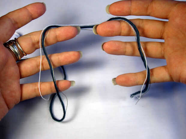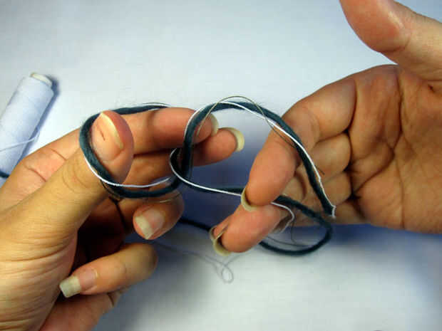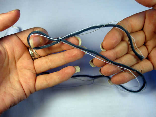 * Mantenga todos los tres filamentos así en tus manos hacer un lazo con el puntero y el pulgar de su mano izquierda y los extremos entre el puntero y el pulgar de su mano derecha.