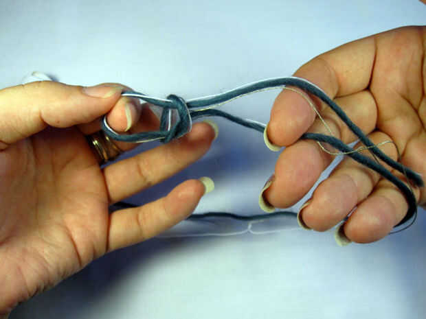 * Dejar los extremos con la derecha y agarrar la hebra con la mano izquierda.