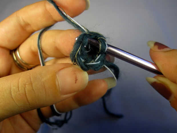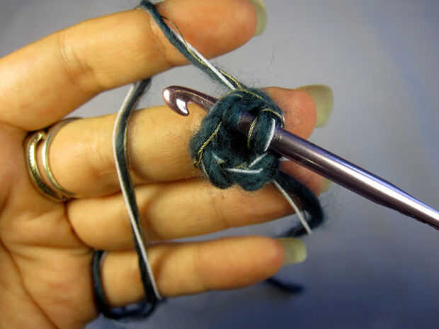 * Asegúrese de empujar el gancho a través de la puntada de sc manteniendo los dos cabos de la V en la parte superior.