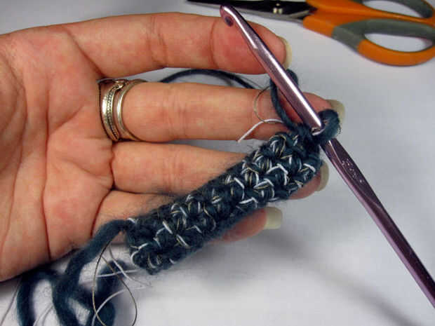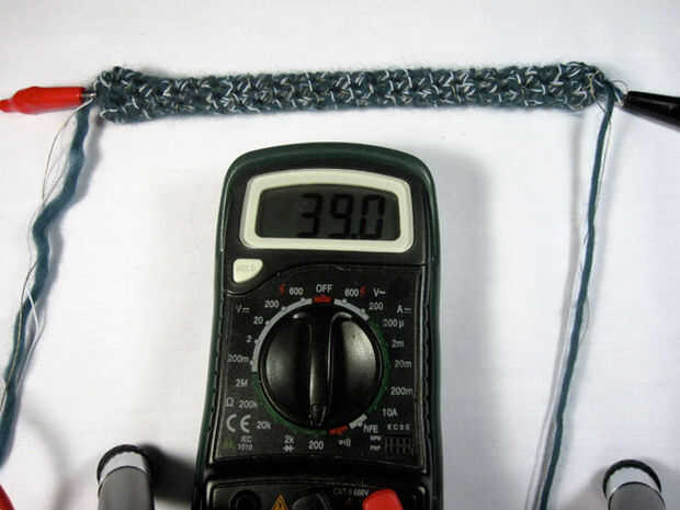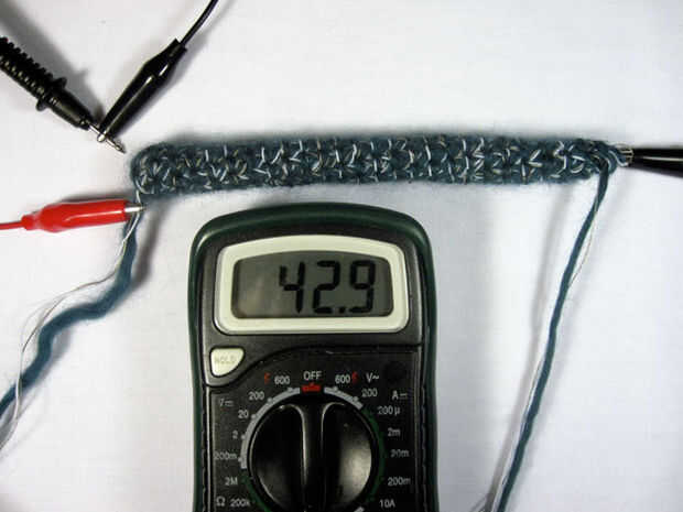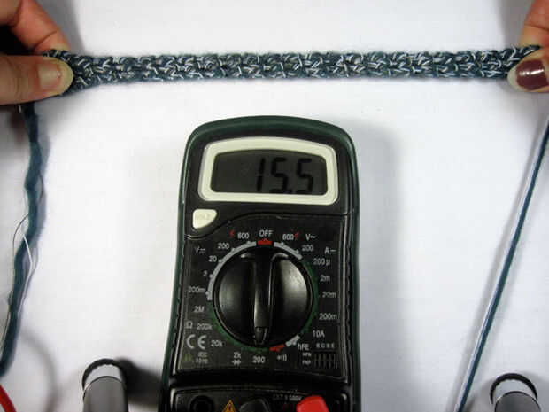 Cuando se estira el sensor, la resistencia disminuirá. Una vez suelta, el elástico ayuda a volver a la longitud original, pero todavía lleva un rato. El último paso del batanado asegurará un broche de presión rápido hacia atrás. La lenta recuperación del sensor puede ser utilizada como es, si esto es lo que deseas, creo que podría hacer un interesante sensor, pero generalmente tienes el cierre hacia atrás.