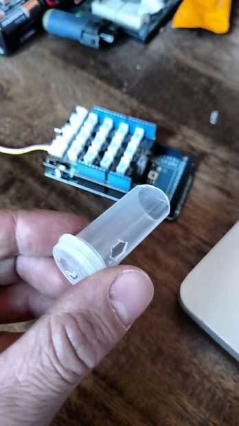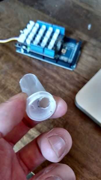 3. corte un pequeño agujero en la parte inferior del tubo que se ajusta sobre el sensor, tan cerca del borde del tubo como sea posible (que tenga que raspar el interior/exterior del tubo para conseguir que montar sobre el sensor y entre las otras partes)