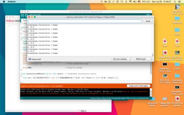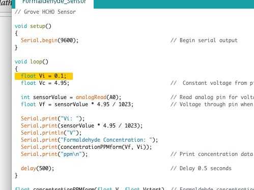 1. antes de la prueba, abre la ventana de Serial y la salida llamada "Vi" (en presencia de sólo aire y sin formol, este valor es alrededor de 0.1V o 0.2V para mí)