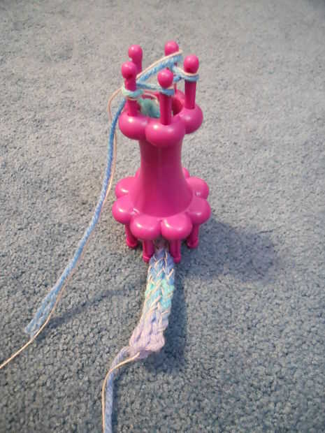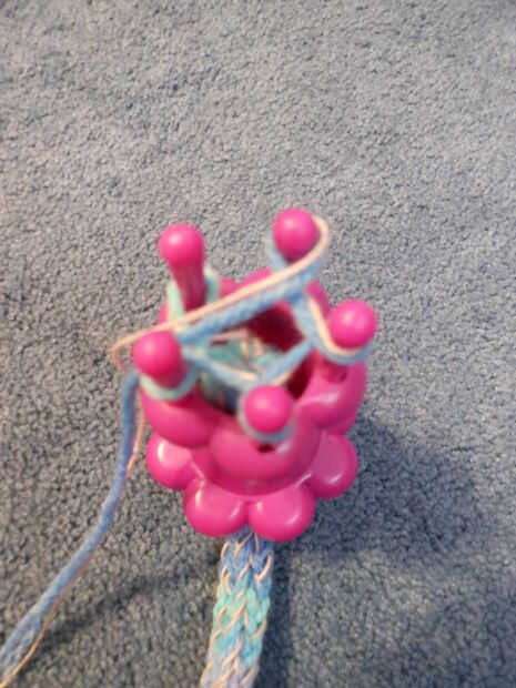Empiece por tomar el hilo normal y el hilo conductor juntos y abrigo alrededor de la parte posterior de la primera en el telar alrededor al frente del poste y luego hacia la izquierda para el siguiente post. Para ello todo el telar entero dos veces. Luego levante la capa inferior de hilo sobre la parte superior del poste y luego envolver otra capa en el telar. Seguir estos pasos hasta conseguir la longitud deseada. El sensor de punto empezarán a aparecer fuera de la base del telar. Al quitar el sensor del telar, asegúrese de cerrar enroscando el hilo regular los lazos cuando elimina de cada post que no vienen plegada.