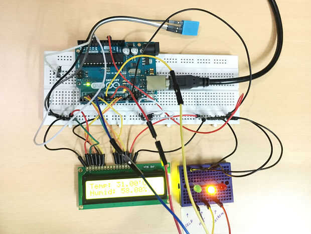 A continuación, se describe step-wise con imágenes pertinentes, cómo enganchar encima de 16 x 2 pantalla de LCD para el Arduino, las conexiones relativas de la configuración de 3 LED y el sensor DHT11.