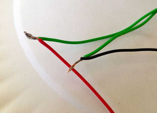 Si está utilizando cable trenzado + un protoboard, usted necesitará encontrar una manera de conectar el cable trenzado en la protoboard (b y c tratando de empujar en los agujeros de la protoboard hará que te quieren tirar el pelo hacia fuera). Dos protoboard cables pelados y soldadas a los cables del sensor. Sin embargo, mis conexiones eran todavía un poco exigentes y sensibles al tacto y cambios en la luz. Probar diferentes métodos y ver qué funciona mejor. Utilizar los materiales disponibles y mantenerlo simple!