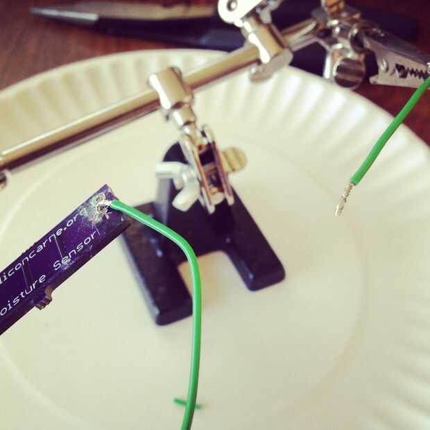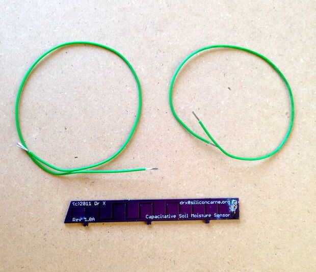 Soldar cables a los electrodos de condensador co-planar (también conocido como sensor de humedad de suelo). Prueba de conexión con el multímetro. Si el sensor está conectado eléctricamente, capa de epoxi y dejar secar antes de continuar.