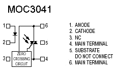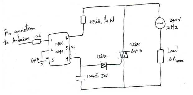 Nuestra carga es nominal 240 V, 50Hz por lo que no puede ser directamente conectado a Arduino. El circuito anterior permite que la bomba a la interfaz con el Arduino. Un circuito interno de la MOC 3041 nos ayuda a entender el circuito anterior.