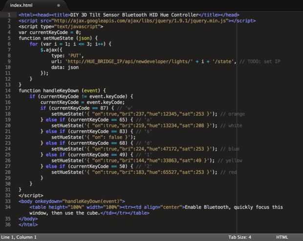 Si usted tiene luces Philips Hue conectado en tu casa, aquí cómo enlazar hasta el DIY 3D sensor de inclinación. Aquí está un video. El Javascript se ejecuta en una página Web y utiliza solicitudes Web para controlar la luz.