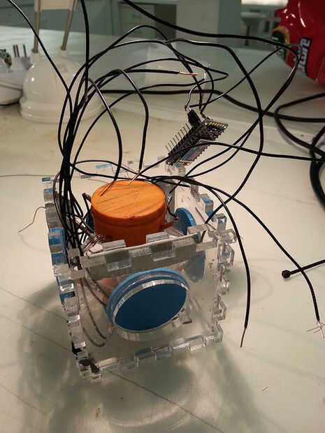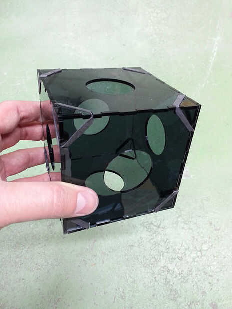 En este caso resultó que el tamaño elegido para el cubo y la cámara no permite suficiente espacio para la electrónica. También, el acrílico grueso tardó demasiado cortado con láser. Una iteración adicional era necesario agregar cortes pequeños para las bandas de goma mantiene todo juntos. La solución es sencilla: iterar hasta que funciona.