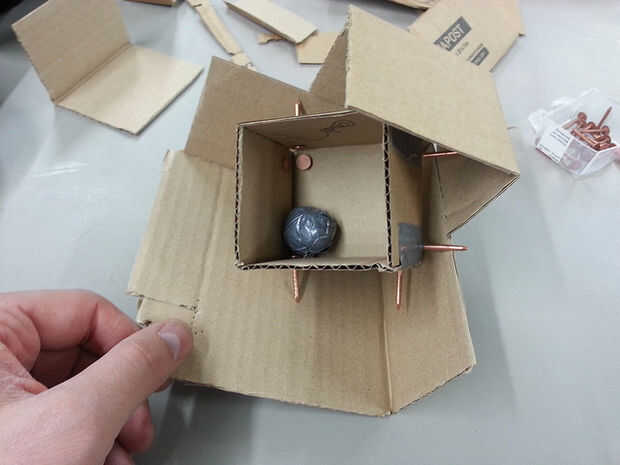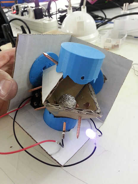 Para probar el interruptor (a base de clavos) una bola de aluminio improvisado fue utilizada con un LED y una batería.