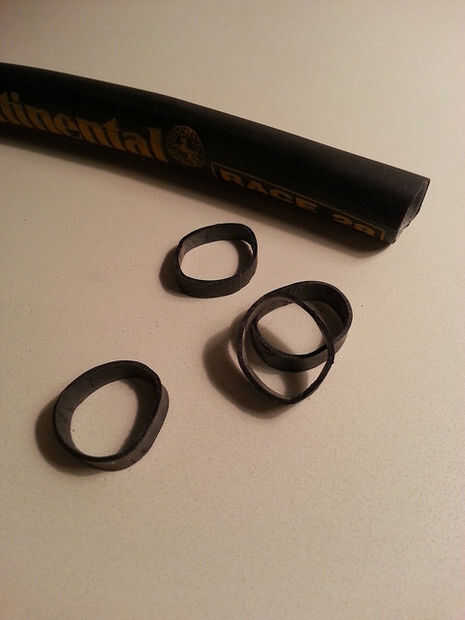 Luego, corte el tubo de bicicleta usada, 5mm de ancho cada uno, unos anillos de goma (24 en total) y perforar para fijar clavos adicionales en los orificios restantes.