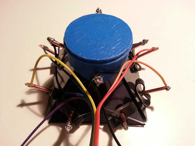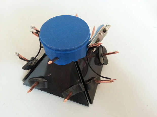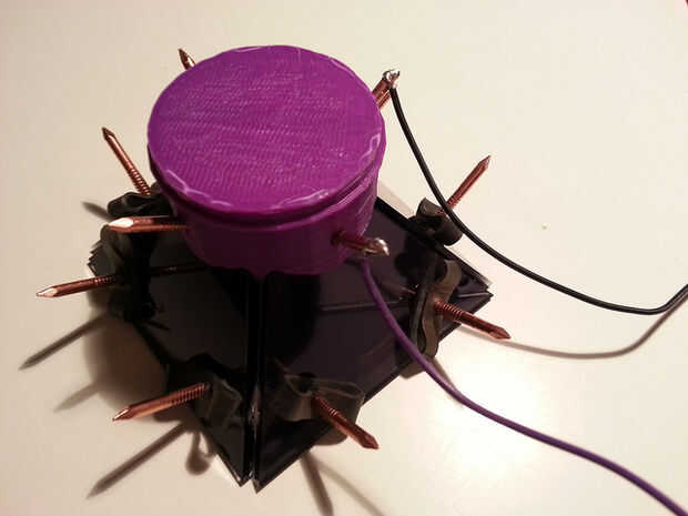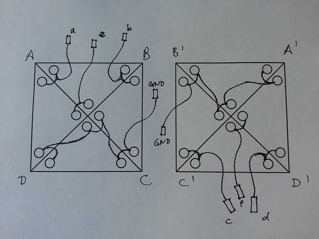 Para las uñas trabajar como un interruptor (junto con la bola) tenemos que conectar dos cables a cada vértice. Como hay cuatro clavos por vértice, cable adicional es necesario para conectar las dos uñas adyacentes (para evitar el rebote). Y porque la tierra es el mismo para todos los vértices, añadir más cable para conectar múltiples clavos a una tierra común.