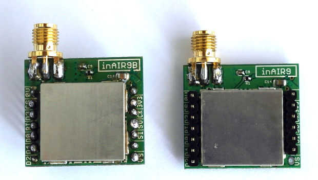 Algunos de mi inAir9B estaba con los módulos soldados las piernas (en la imagen) y algunas me soldó por mí mismo (a la izquierda en la fotografía). Presoldered los módulos tienen las piernas por encima de las etiquetas que no es conveniente desde mi punto de vista porque si utilizas protoboard no puede ver lo que está escrito en él. Así que mis módulos soldado con las piernas hacia abajo. Pero a usted lo elija.