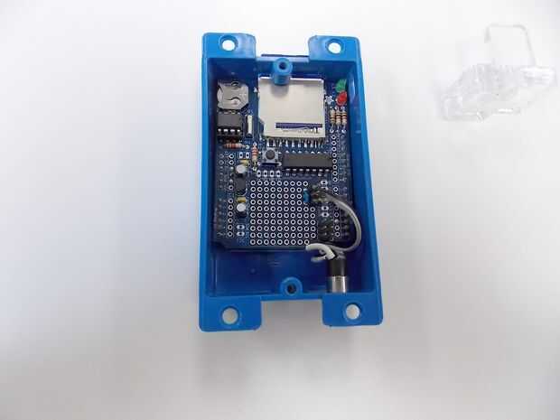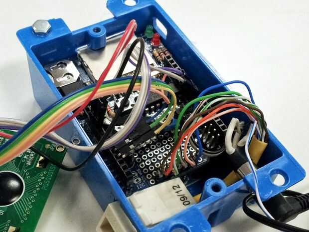 Si está utilizando una pantalla de LCD 16 x 2, cable hasta los encabezados de la pantalla de registro de datos como se describe en la Página Web de Adafruit , así (el potenciómetro para ajustar el contraste del LCD se puede montar en la zona libre de prototipos en el escudo). Como se puede ver en las fotos de arriba, conectar el LCD con los cables de puente lleva una buena cantidad de espacio. Tratamos de doblar los cables puente planos hacer que todo quepa debajo de la tapa gris, pero eventualmente nos hiere para arriba de una caja eléctrica en segundo lugar, para un recinto de doble altura de apilamiento. (No dude en ignorar el conector adicional de Cat5 que tenemos conectados a algunos de los pernos restantes. Que uno está pensado para un opcional acelerómetro - si estamos midiendo la salida ligera de algas bioluminiscentes en respuesta a la agitación, sería bueno poder medir exactamente cuanto estamos sacudiéndolos. Todavía no hemos utilizado esta función hasta el momento y el código de arduino a continuación no incluye el acelerómetro).