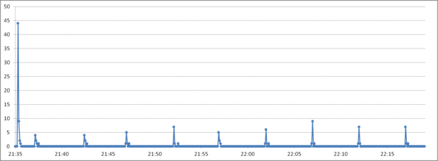 El gráfico muestra la cuenta de pulso crudo, integrado en 5 intervalos de segunda. Nuestro tubo de control alcanzó el 44 pulsos de 5 segundos, o 8.8 Hz. Dado una respuesta de irradiancia de 2,3 kHz/(μW/cm2), que corresponde a 0.0038 μW/cm2, o Lux 0.026.
