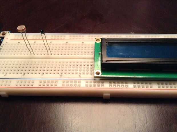 Su LCD en la protoboard y la LDR y el termistor cerca de la pantalla LCD.