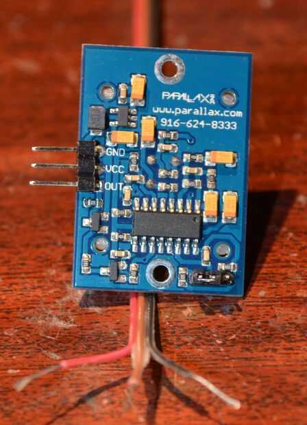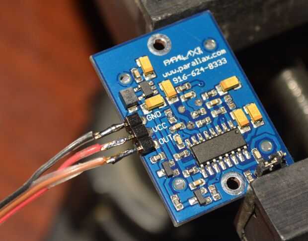 El sensor PIR tiene tres pernos... VCC, GND y OUT. Utilicé cable de cinta multicolor para el cable en este proyecto, ya que creo que es más fácil de asegurarse de que se cubrió a derecha (y tenía por ahí algunas). Como se puede ver en la segunda foto, fui con negro a GND, rojo a VCC y marrón a la salida.