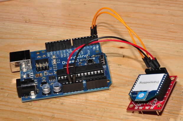El método más sencillo sería un shield XBee conectado a la placa y un receptor XBee en el otro lado. El receptor puede ser un simple XBee conectado a un convertidor FTDI USB Serial.