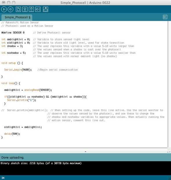 2. la célula fotoeléctrica debe imprimir valores el monitor serie. Si pasa el cursor una sombra sobre la fotocélula, usted notará una disminución en estos valores impresos.