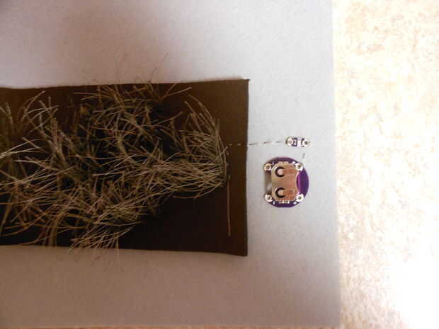 Sin embargo, hay un truco en un fieltro parche debe ser utilizado para asegurarse de que la costura no se cruzan. La forma más sencilla de lograr esto es coser un circuito completamente y luego trabajar en la otra. Cuando usted está cosiendo el segundo circuito y llegar al punto donde hay que coser en la parte superior cosiendo que previamente hiciste, tome el pequeño pedazo de fieltro y coser sólo la capa superior para que ninguna costura viene a través de todo el camino. Luego coloque el parche en su lugar sobre la costura completado y continuar con el sensor.