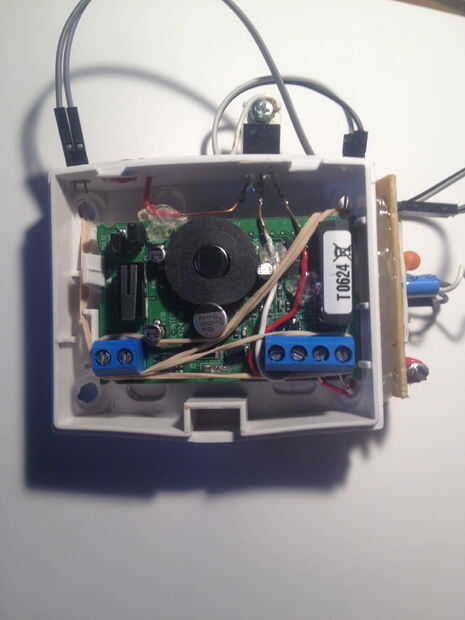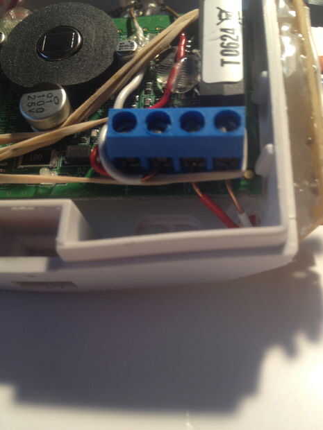 En primer lugar tomar los cables de alimentación para el transmisor y poner el positivo en el NC y la negativa en puertos C. Se muestran en las fotos anteriores. Si tiene sensor de movimiento no está etiquetado o es diferente es muy fácil de averiguar los puertos que son.