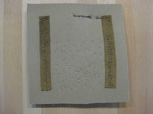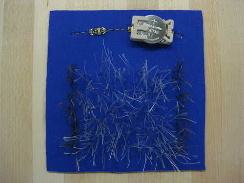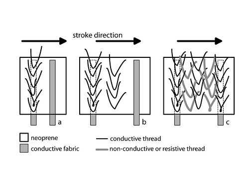 Podrían aplicar diversas técnicas para crear este tipo de "sensor de movimiento" como tejer o ganchillo puntada bucle o técnicas de anudado de la alfombra. Este Instructable muestra cómo coser un hilo conductor 117/17ply plata nylon plateado y un 66 más resistente hilo 22 + 3ply 110 PET hilo en neopreno con el fin de crear un "sensor de movimiento". La gomosidad del neopreno crea suficiente fricción para que la rosca no se aflojará cuando acariciando. Lo que significa que no tiene nudo cada pelo individual. Es importante hacer uso de estos hilos particular como más gruesos hilos conductores tienden a encresparse cuando acarició repetidamente y así no trabajan para el movimiento detección ya.
