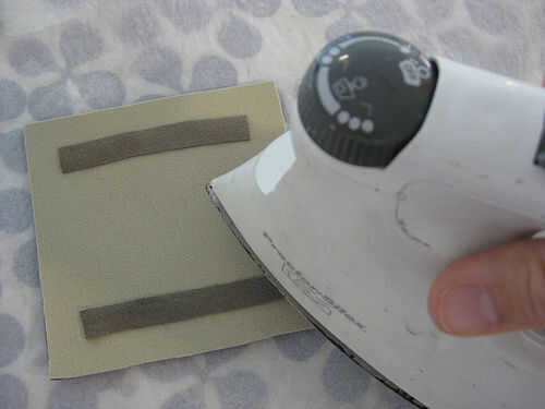 Cortar un trozo de neopreno tan grande como quieras el sensor. Corte dos tiras de tejidos conductores elásticos con entretela fusible adherido a un lado y fusible de extremos opuestos de la parte posterior del neopreno. Ver fotos de referencia.