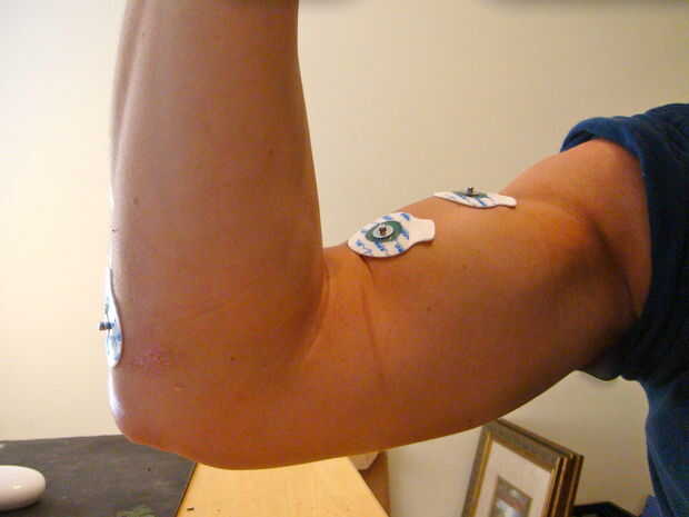 Después de determinar que grupo muscular quieres apuntar (por ejemplo utilizaré mi bicep derecho) y limpiar la piel cuidadosamente, coloque un electrodo en la piel por encima de la mitad de la longitud del músculo deseado. Llamemos a esto el electrodo muscular media.