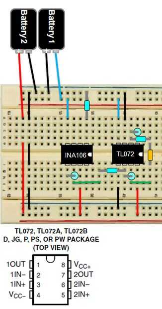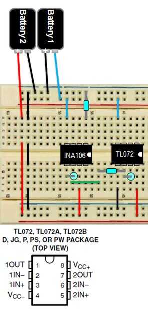 Chip de lugar B como el cuadro indica. Ahora uso un cable puente y conectar el pin 6 del chip A últimas dos filas pin 8 de la viruta del gancho agarrador de A. una de las resistencias de 10 kOhm y conecte uno de los pines de esta fila también. Conecte los otros 6 pin a pin del chip B. curva una resistencia de 150 kOhm y un pin a pin del chip de B 6 y el otro al pin 7. Se puede calcular la ganancia de G =-R2/R1 o en este caso kOhm-G = 150 / 10 kOhm. (Ver imagen 1)