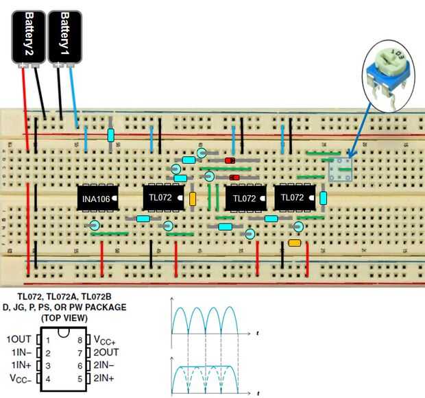 Es el final del circuito del filtro. Sin embargo, puesto que se trata de un filtro activo, es un efecto secundario de invertir la señal. Tendremos que invertir la señal una vez más (y tienen la capacidad de amplificar más si desea) usando un circuito amplificador inversor con un condensador de ajuste configurado como una resistencia variable.