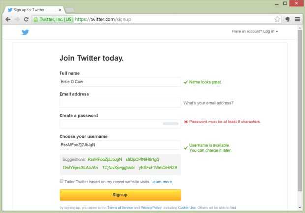 Crear una cuenta de twitter para tu sensor en https://twitter.com/signup. No seas demasiado exigente con el nombre de usuario. A menos que quieras todo el mundo para ver el nivel del agua, es probablemente mejor usar una de las sugerencias generadas al azar. Es mejor crear una nueva cuenta para sus sensores en vez de reutilizar una cuenta existente y para que tus seguidores de twitter leal no sienten como estás recibiendo spam con datos de M2M.
