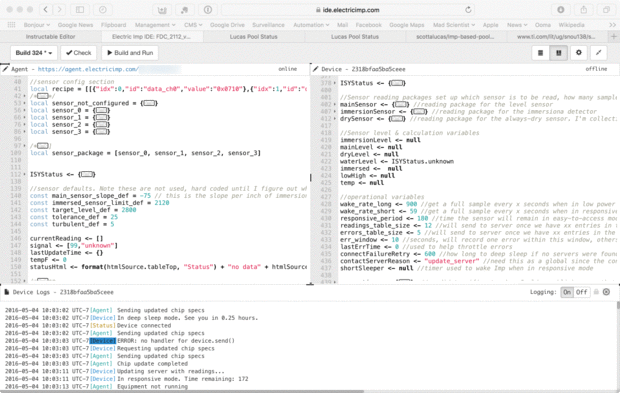 La plataforma eléctrica Imp usa dos entidades de software. Se ejecuta el código de "dispositivo" en el Imp en su sensor. El código de "agente" se ejecuta en servidores de Electric Imp en la nube. El código está aquí.