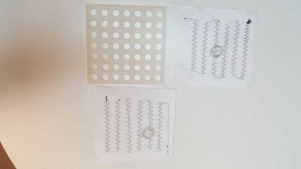 Al final tienes 2 piezas de tela con el hilo conductor y una pieza de espuma con agujeros.