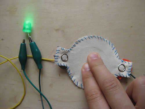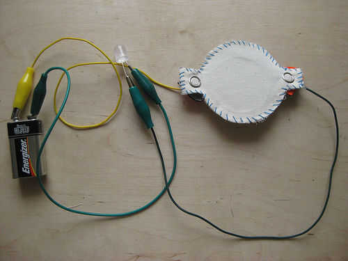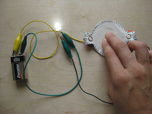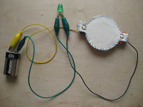 Conecte el positivo de una batería de 9V a un lado del sensor de presión de la tela (no importa qué lado) y conecte el otro extremo del sensor de presión para el plus de un LED o cualquier lado del motor de la vibración (conmutación plus minus sólo afecta a la dirección del motor de vibración, mientras que un LED sólo funciona en una dirección). Conecte el negativo de lo LED o el otro otro lado del motor de la vibración para el negativo de la batería de 9V.