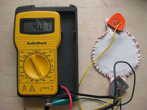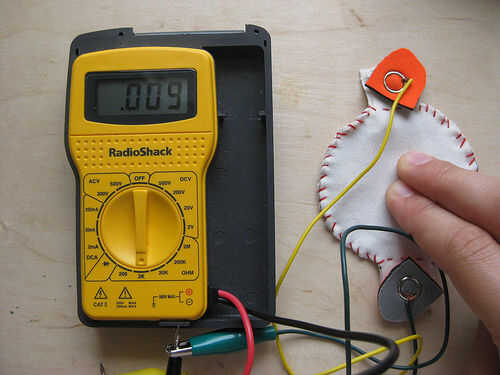 Conecte el multímetro plus a un lado del sensor de presión de la tela (no importa qué lado) y multímetro menos al otro lado del sensor de presión de la tela. Presión y ver el valor de la resistencia a cambiar. Que tendrás que ajustar el rango Si no ves nada. Si tienes una conexión constante entonces cualquiera olvido poner el Velostat en el medio o en algún lugar sus dos piezas de tela conductora se toquen.