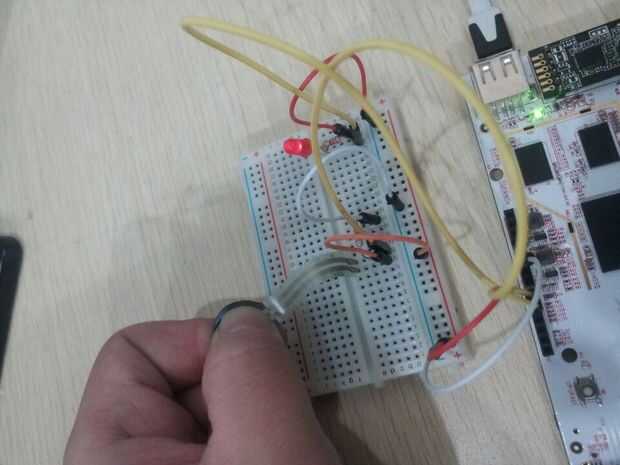 Utilizamos A0 y A1 del pcduino en este experimento, los dos son 6 bits AD, por lo que el valor leído es 0 ~ 63. Si utiliza A2 ~ A5(10 bit), el código debe cambiarse por un número entre 0 ~ 1024 o LED será luz en cuando toca.