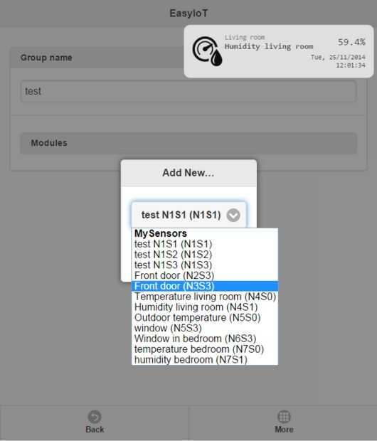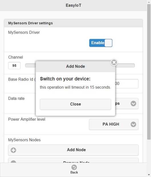 En el navegador Web vaya a Configuración -> Drivers -> MySensors -> controlador de MySensors y luego añadir nodo. Ahora encienda su nuevo sensor. Si tienes éxito veremos nueva dirección de sensor (no mensaje de tiempo de espera). Después de que crear nuevo grupo Configurar -> grupos y módulos -> Agregar grupo. Agregar nuevo grupo e ir en grupo recién creado. Ahora añadir el nuevo sensor. Después de eso veremos nuevo sensor en la Página principal. Puede Agregar sensores de hasta 254.