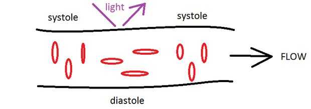 Junto a la absorción de las células sanguíneas, su comportamiento de flujo tiene un papel importante. La imagen se muestra indica que los glóbulos se mueven en una dirección que se alinean ortogonal a la dirección del flujo, cuando están apareciendo flujos altos. Es el caso de la fase sistólica. Con este comportamiento, el reflectante de las células de la sangre de y aumento durante la fase sistólica y diastólica, que conduce a una cambiante intensidad de la luz reflejada.