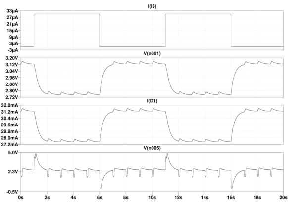 La señal pulsada de la "DC", que representa el precipitado diferentes colores de piel, debe ser ajustada por el regulador. Este circuito simplemente mide la variable DC actual como un voltaje de DC y alimenta la tensión por la fuente de corriente que el voltaje en un tamaño apropiado (hecho por amplificación). La variable DC corriente de diodo de la foto se muestra como actual I(I3) en el primer gráfico. Esta corriente se traduce a una señal de voltaje en el circuito (segundo gráfico). La señal de pulso es ligeramente visible en la parte de DC variable. La salida del controlador se muestra como V(n001). Después de dar este voltaje en el conductor del LED, la corriente a través de los cambios de LED (I(D1)). Se puede ver, que no hay ninguna gran diferencia entre el cambio de corriente continua y el cambio de LED actual, que es obviamente muy buena para el control de propósito