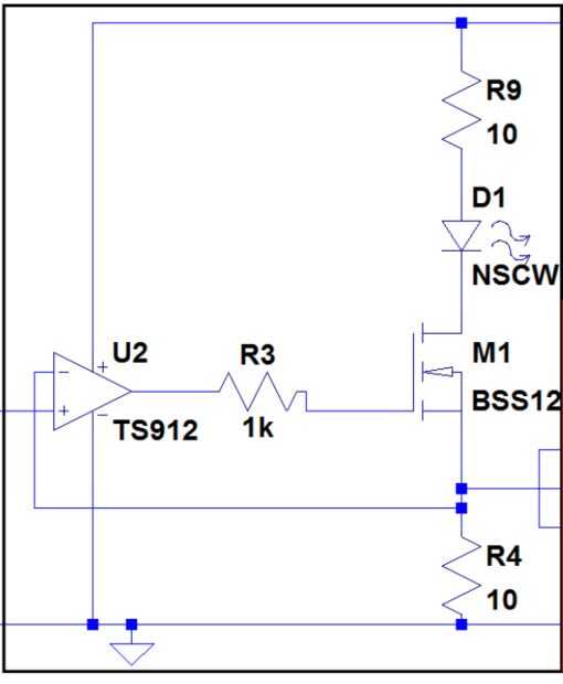 la llamada por actual fuente de tensión, que se muestra en la segunda foto. Éste debe ser bien conocido y se muestra en la imagen 2. En este caso, la corriente por el LED se define por la tensión de entrada OpAmps dividida por la resistencia de 10 ohmios.
