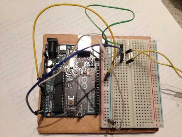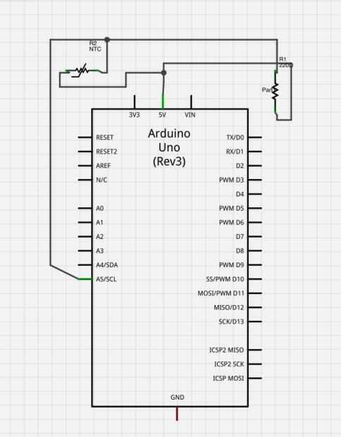 Siguiendo el esquema, construir el circuito en el protoboard como se muestra en la tercera foto. Un cable del termistor de la sonda de temperatura Vernier está conectado a 5V, mientras que el otro está conectado al pin analógico Arduino A5. Use la resistencia de 220Ω para este circuito.