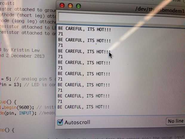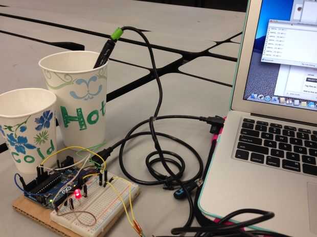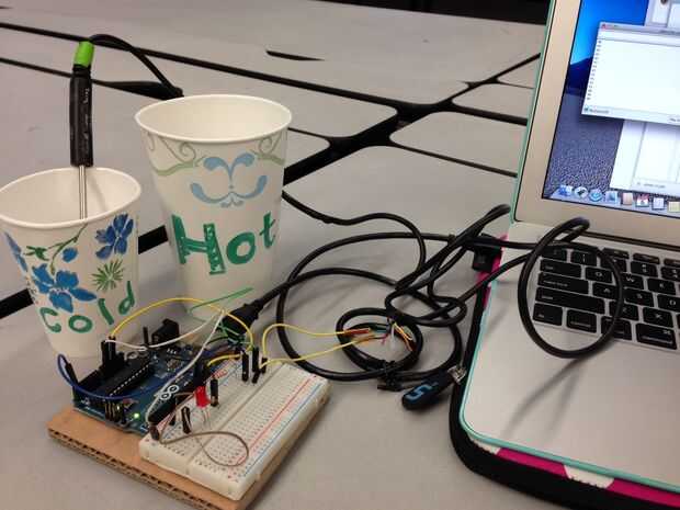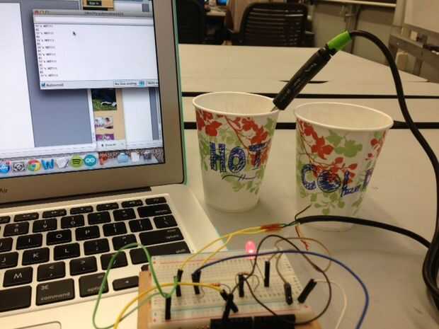 Llenar dos vasos con agua; uno con agua caliente y el otro con agua fría. Conectar tu Arduino al ordenador usando un cable adaptador y abra el Serial Monitor de Arduino.
