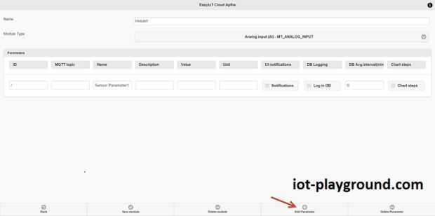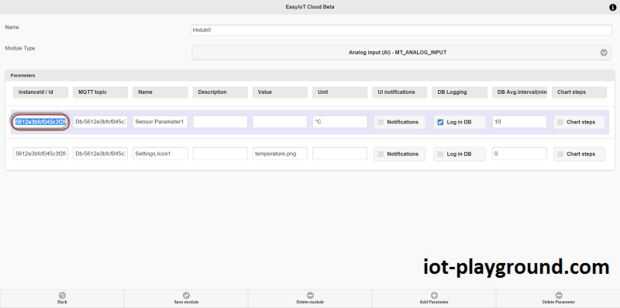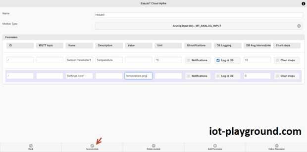 Registro de servicio en la Nube EasyIoT . A continuación, vaya a Configuración -> módulos -> módulo de agregar y seleccione tipo de módulo de entrada analógica. Para el primer parámetro establece Descripción a la temperatura, la unidad en ° C o ° F, habilitar registro de base de datos y Avg.Interval DB a 10. Para el segundo parámetro cambia el nombre a Settings.Icon1 y establezca el valor a temperature.png. Después de establecer valores Presione botón Guardar módulo.