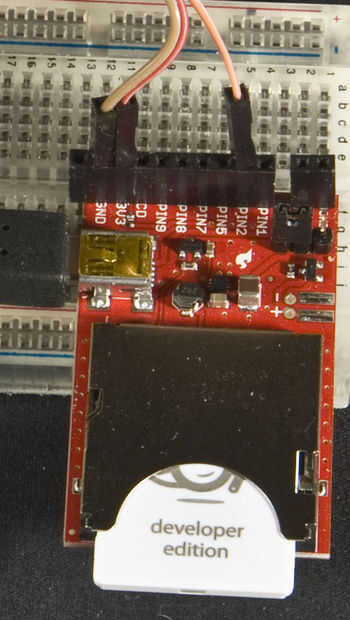 Una palabra rápida sobre la terminología eléctrica imp. El dispositivo en este caso la Junta de abril, el termistor y la resistencia con cableado asociado se llama un impee. (Sí, más bajo del caso 'i'). El componente de tarjeta SD se llama a un diablillo. El imp cuenta con el procesador y 'cerebros' controla el impee (dispositivo de hardware). Ver http://devwiki.electricimp.com/doku.php?id=glossary para más información sobre la terminología eléctrica imp.