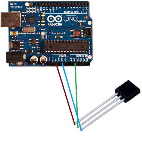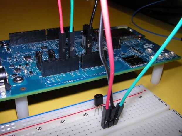 cables (sé lo que estás pensando...). Una vez que tenga la superficie plana del sensor frente a usted, conectar la clavija a la izquierda del sensor en el riel de 5V en los pines de alimentación de la Junta, el pin central del sensor analógico a1 entrada en el tablero, el eje derecho del sensor a la tierra (carril de tierra) en la placa, que es el sensor de.