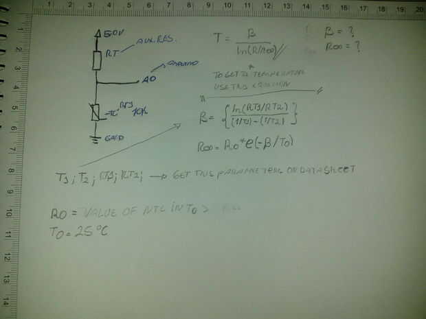 Β = define la temperatura diferencial para calibrar el sensor con la temperatura inicial y temperatura final T1, T2 y sus resistencias. R∞ = modelos de la función exponencial. Parece un poco duro, pero todos los valores que necesitamos se tabulan lógico el microcontrolador para hacer los cálculos y entregar la temperatura leída. Definición de valores (las temperaturas en grados Celsius C) para calibrar el sensor se utiliza a las temperaturas T1 (inicial) = 0 ° C, T2 (final) = 100 °, T0 = 25 ° C este y ambiente temperatura de funcionamiento, las temperaturas T1 y T2 se han fijado para el medio ambiente a utilizar, como T0 es el valor de la resistencia del termistor por defecto 10Kohm, el RT1 y RT2 de valore en Datasheat sensor.