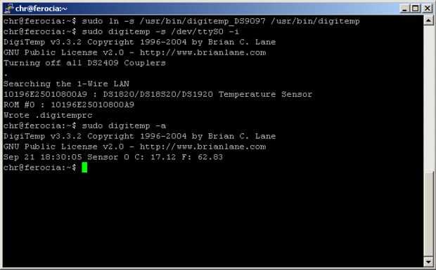 Ejecute 'digitemp - a' para leer la temperatura de la tempsensor conectado.