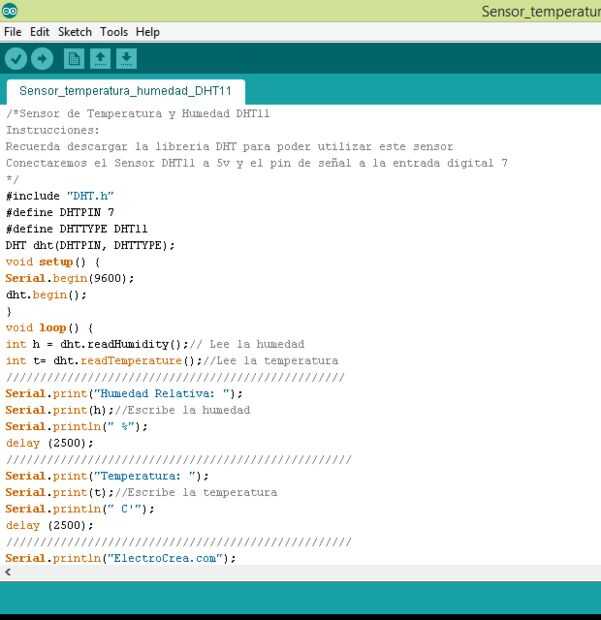 En el siguiente ejemplo tenemos un codigo lee la temperatura y humedad de el sensor DHT11 conectado al pin 7 y luego muestra los resultados en el monitor serie. Recuerda para el cogido funcione es necesario descargar la librería de el sensor aquí. Copia y pega esta librería en tu carpeta de librerias de Arduino.