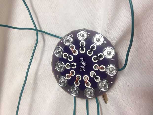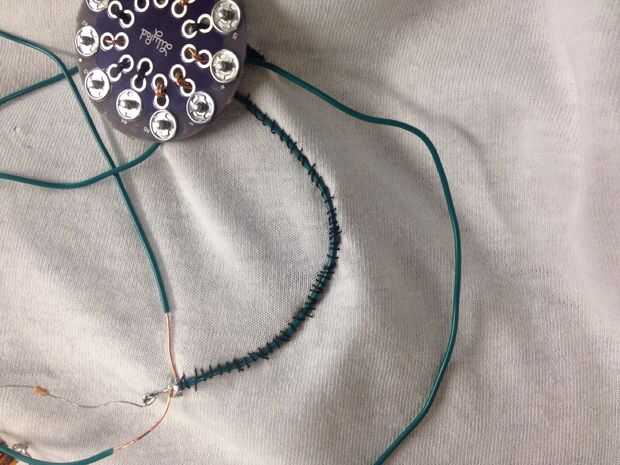 Asegurar la placa de coser/bucle a través de los agujeros sin ocupar en el LilyPad al menos 3 veces. Coser todos los cables firmemente. Envolvimos nuestro hilo alrededor de los cables dejándolos como bastones de caramelo casi (mostrado arriba). Coserlas firmemente y cuidadosamente para evitar que los cables moverse. Coser el resto de componentes, así como el botón, tablero de la vibración y flex sensor pasando a su alrededor con hilo. Este es un proceso lento, pero un exhaustivo trabajo produce los mejores resultados para un dispositivo portátil.