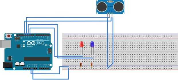 A pesar de que los LEDs no contribuyen mucho a nuestro proyecto (soy un gran fan de las cosas de colores :)) podemos utilizar el LED rojo para mostrar si hay alguien parado en el frente y verde de lo contrario.